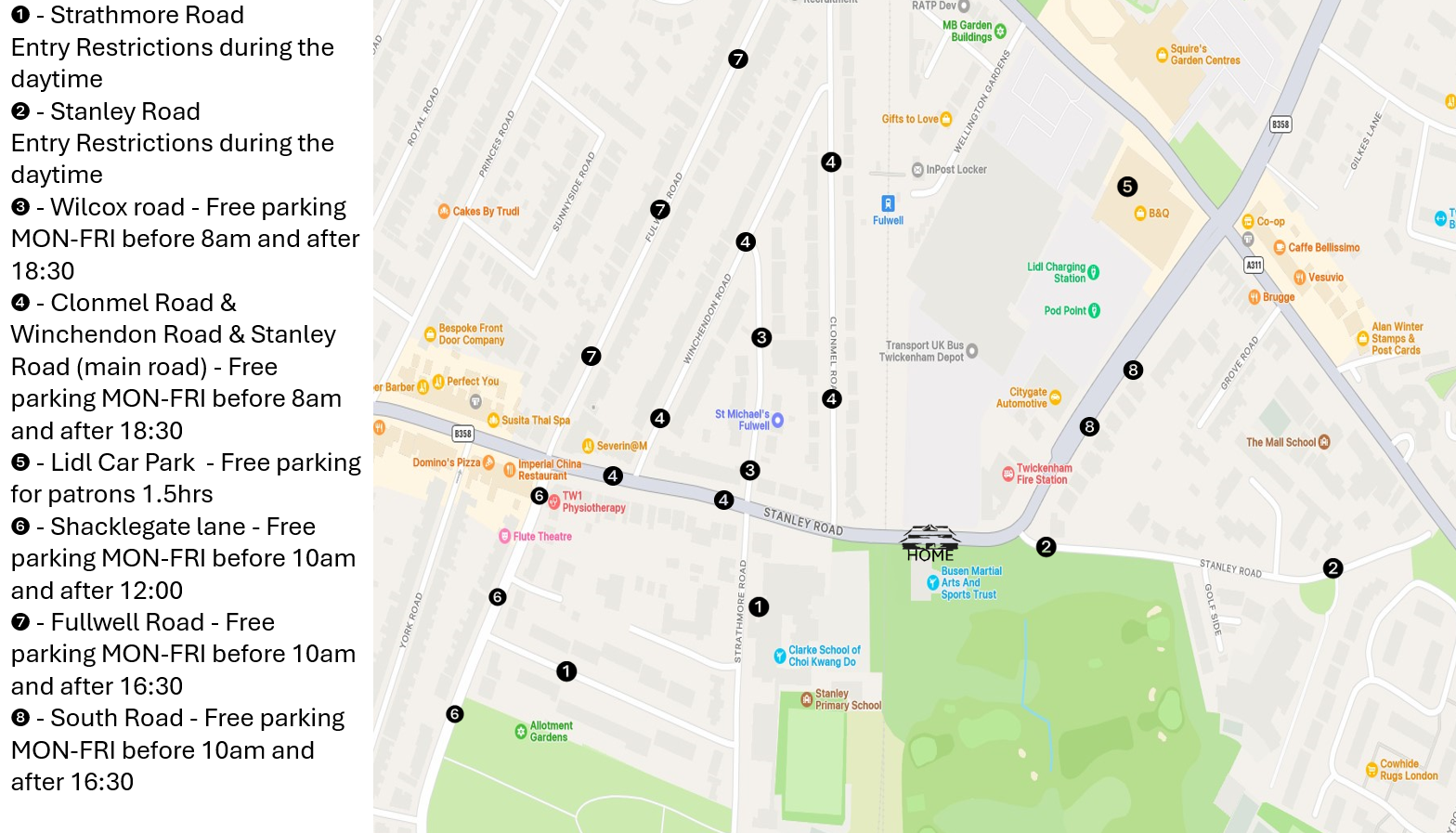 When we have Courses/Gradings/ Centre events on Sunday's the parking restrictions in the local area are not enforced. So please see this picture as it will help you with alternative parking.