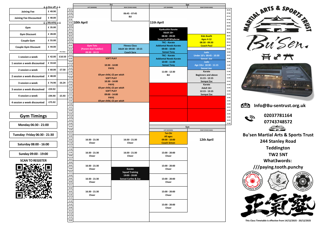 Here’s the updated timetable for Bu’sen Martial Arts & Sports Trust, live from Monday 2nd February 2026!